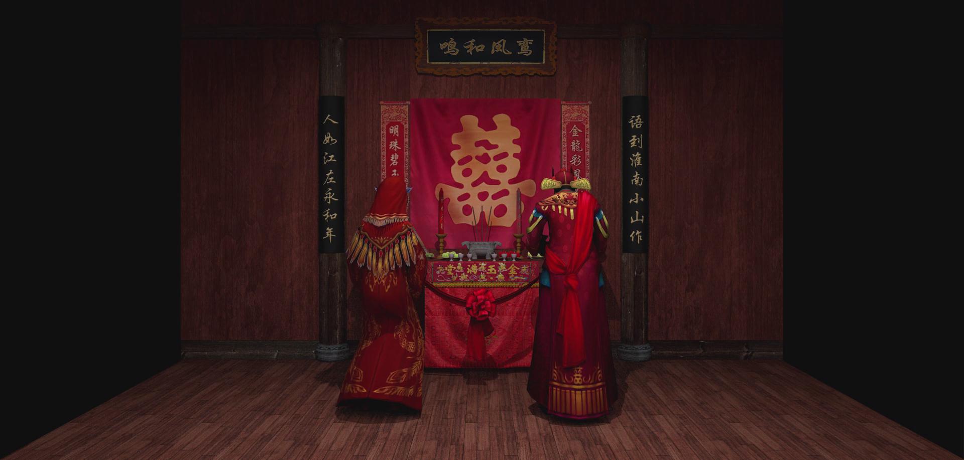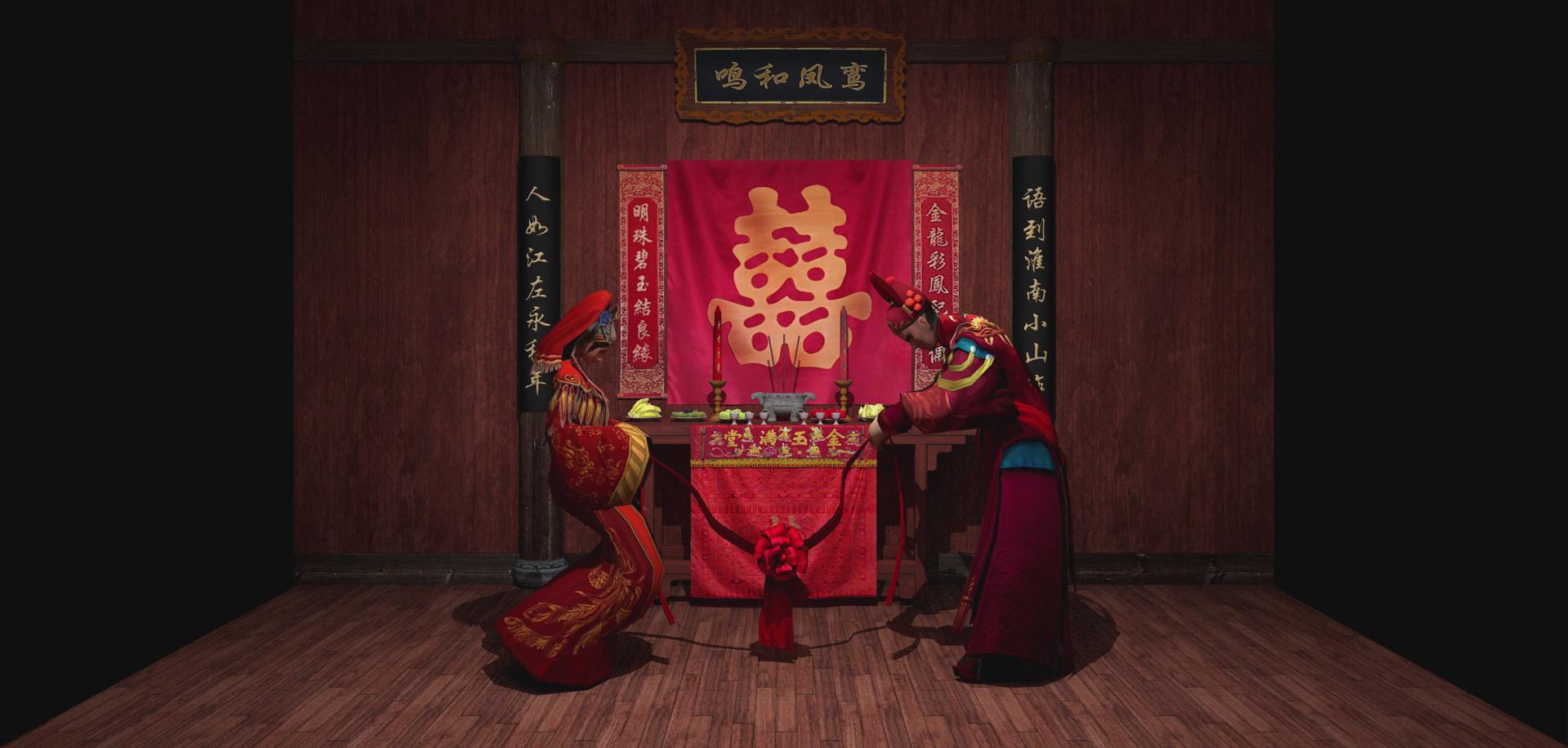 漢族先人認(rèn)為黃昏是吉時(shí),所以會(huì)在黃昏行娶妻之禮,因此夫妻結(jié)合的禮儀稱為“昏禮”,后來演化為婚禮。漢族人認(rèn)為紅是吉祥的象征,所以傳統(tǒng)婚禮習(xí)俗總以大紅色烘托著喜慶、熱烈的氣氛。吉祥、祝福、孝敬成為婚禮上的主旨,幾乎婚禮中的每一項(xiàng)禮儀都滲透著中國(guó)人的哲學(xué)思想。影片描述了漢族傳統(tǒng)婚俗拜堂過程,先是燃炮后是拜堂,體現(xiàn)了中國(guó)傳統(tǒng)文化的精髓。